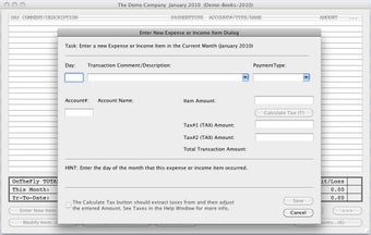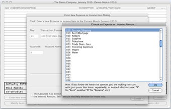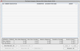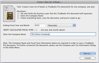 Note that to use TinyBooks Pro, you'll need an Intel Mac. TinyBooks Pro can be a little overwhelming at first because the interface isn't exactly easy on the eye. There are a lot of features and options to take in. When you open it for the first time, you are taken through a wizard to setup your first file. Each TinyBooks Pro document covers one business or account for one year. To create a new TinyBooks Pro document, just select New item from TinyBooks Pro's File Menu.